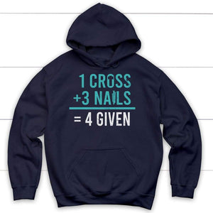 Adorn yourself with the profound message of faith and forgiveness with this "1 Cross + 3 Nails = 4 Given" hoodie. Ideal for church gatherings, casual outings, or cozy days at home, it serves as a constant reminder of Jesus' ultimate sacrifice and the gift of salvation. The bold teal and white design stands out, encouraging conversations and inspiring those around you. This hoodie makes a thoughtful gift for friends and family, highlighting God's boundless grace and love. Embrace warmth and faith with this meaningful and stylish piece.