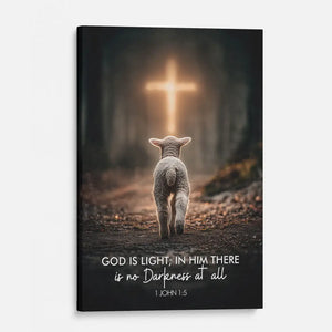 Let your heart find peace in the truth that God is light, and in Him there is no darkness at all. This Christian wall art canvas shows a little lamb walking toward a glowing cross in the woods, a picture full of hope and trust. Inspired by 1 John 1:5, it reminds us that no matter how dark life feels, God’s light leads the way. The lamb stands for each of us—following Jesus, the true Light, even through shadows and unknown paths. It brings comfort and reassurance that God is always near and darkness will never win.