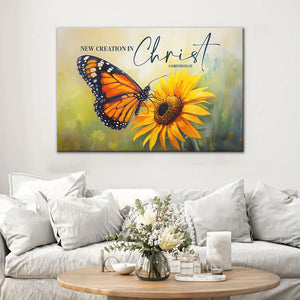 This Christian wall art canvas features a painting of a butterfly and sunflower, paired with the 2 Corinthians 5:17 Bible quote, 'New creation in Christ.' It's a reminder of God's goodness in transforming us into new creations. The artwork serves as a beautiful and encouraging gift.