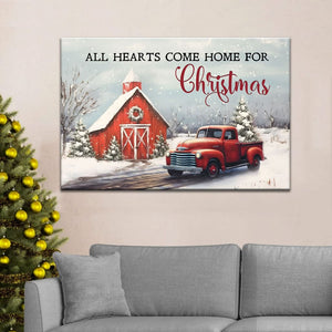 This 'All Hearts Come Home for Christmas' wall art canvas adds a warm, festive touch to any room. It shows a cozy scene with a red car carrying a Christmas tree and a red barn in the distance. It's a great reminder that Christmas brings us all back home, no matter how far we roam. It's a great piece for your own holiday decor or as a thoughtful Christmas gift for loved ones.