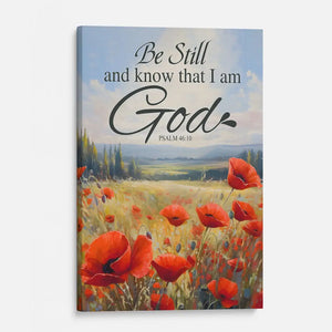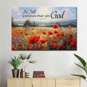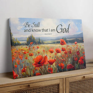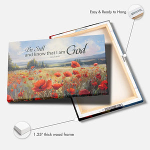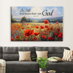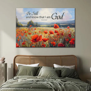 Hang our "Be Still and Know That I Am God" wall art canvas in your living room, bedroom, or office to infuse your space with tranquility. Featuring a serene poppy field and Psalm 46:10, this canvas print serves as a constant reminder to pause, reflect, and recognize God's presence in our lives. It makes a thoughtful gift for friends and loved ones on any occasion.