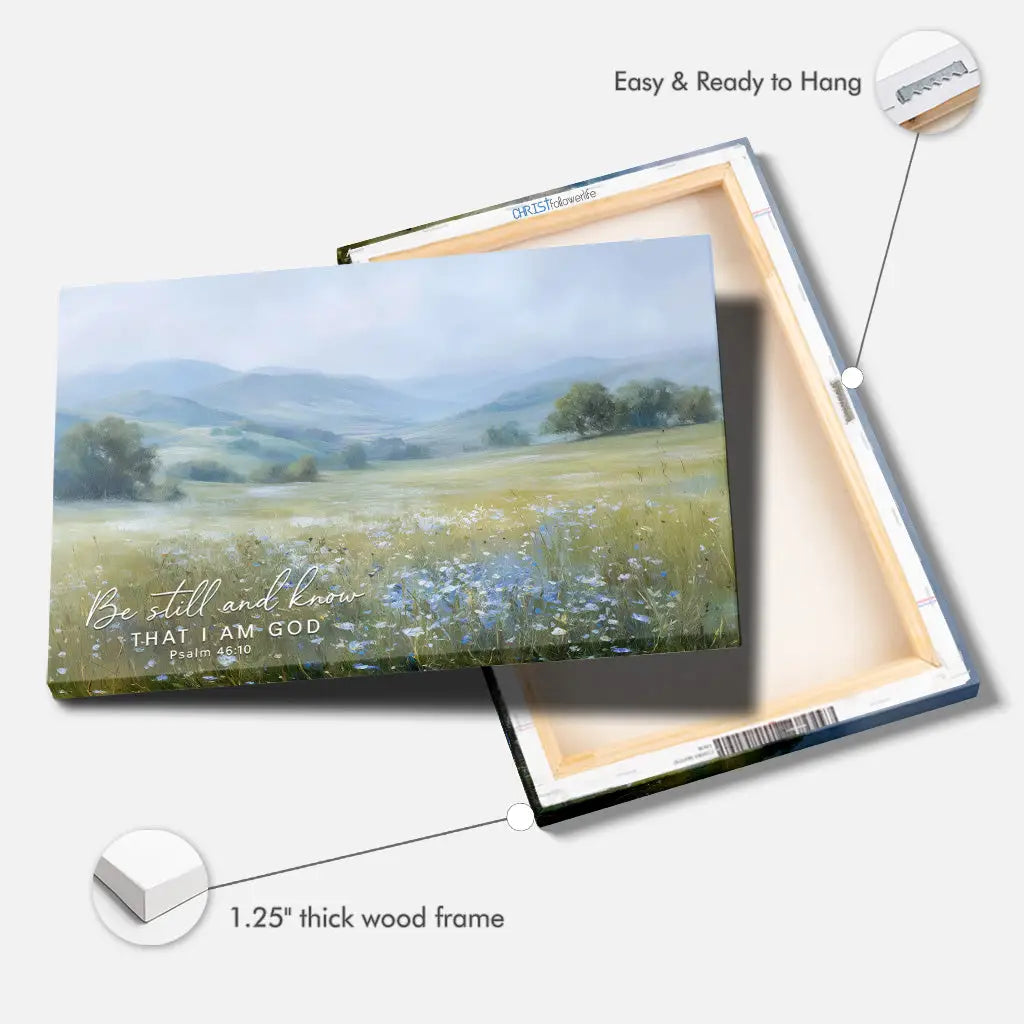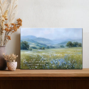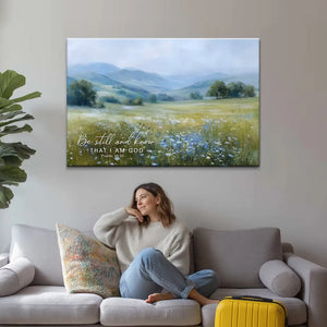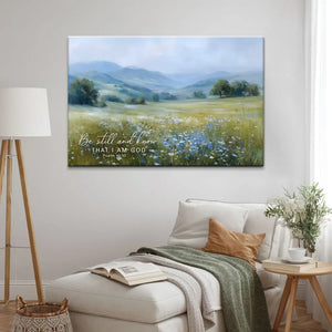 Feel God’s calm as this Christian wall art canvas gently calls your heart to “Be still and know that I am God.” The soft hills, open field, and light flowers show a quiet place where worry fades and faith grows. It brings a warm, peaceful feeling to your home and reminds you each day that God is in control.