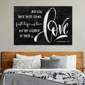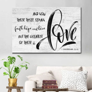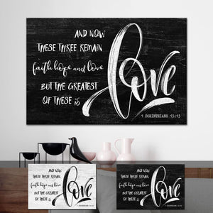 This Bible verse wall art canvas features a Farmhouse style and the 1 Corinthians 13:13 NIV Bible verse 'And now these three remain: faith, hope and love. But the greatest of these is love.' A perfect Christian gift for your friends and loved ones.