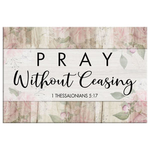 This Christian wall art canvas features flower paintings with the 1 Thessalonians 5:17 Bible quote 'Pray Without Ceasing.' This Bible verse wall art provides an inspirational reminder to spend time in prayer with God throughout your day. A meaningful Christian gift for any occasion and to encourage a friend or loved one in their faith journey.