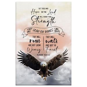 This Christian wall art canvas carries the inspiring verse from Isaiah 40:31, "but those who hope in the Lord will renew their strength. They will soar on wings like eagles; they will run and not grow weary, they will walk and not be faint." It's a powerful reminder of the strength and endurance that faith in the Lord provides. Perfect to hang in any space where you need a boost of encouragement, this canvas is a great gift for anyone who takes comfort in their faith, suitable for celebrations, as a get-well wish, or just because. It brings a message of hope and resilience into any home.