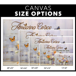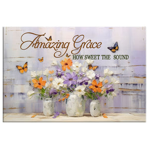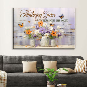 This Christian wall art canvas, featuring a painting of butterflies on flowers and the classic hymn, 'Amazing Grace, how sweet the sound,' serves as a daily reminder of the sweetness of God's grace. This canvas print makes a thoughtful Christian gift for all occasions.