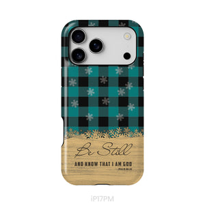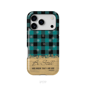 Be still and know that I am God, teal black buffalo plaid, Christmas phone case