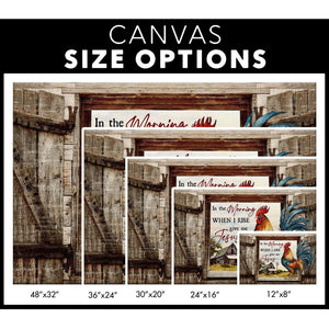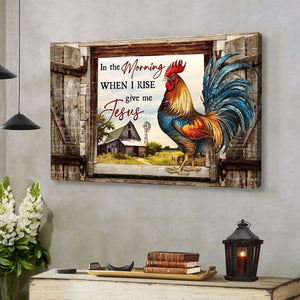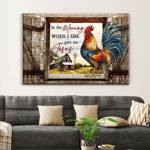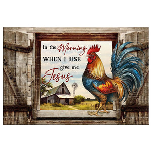 This Christian wall art canvas with a farmhouse style, features a chicken and an old barn on a farm along with the saying 'In the morning when I rise, give me Jesus.' It's a perfect gift for your friends and family for all occasions.