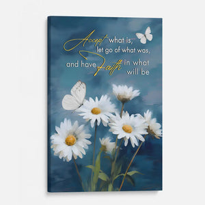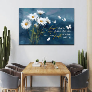 Hang this 'Accept what is, let go of what was, and have faith in what will be' wall art canvas in your home or office to foster a sense of serenity. Featuring daisies and butterflies, it's a calming scene that invites reflection. Ideal for any room where you seek peace and inspiration. Christian wall art makes a beautiful gift, offering a gentle reminder of faith and acceptance for any occasion.