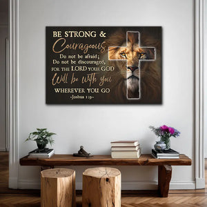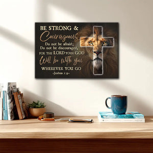 Feel God’s strength with this bold Christian wall art canvas featuring Joshua 1:9. "Be strong and courageous. Do not be afraid; do not be discouraged, for the Lord your God will be with you wherever you go.” The lion behind the cross shows Jesus as the Lion of Judah—strong, faithful, and always near. This verse brings peace and courage for every step in life.