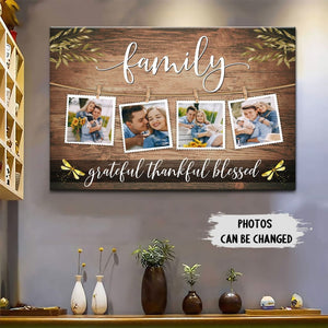 This Grateful Thankful Blessed Wall Art Canvas features the word "Family" in beautiful script, with space for your favorite photos clipped onto a rustic string on a wooden background. Decorated with leaves and dragonflies, it brings feelings of gratitude and blessings.