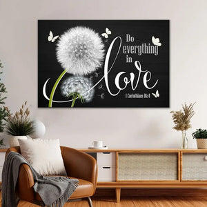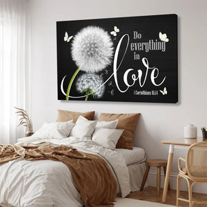 This Christian wall art canvas features 1 Corinthians 16:14, "Do everything in love," surrounded by delicate dandelions and fluttering butterflies. This canvas art serves as a daily reminder of God's call to love in all actions. Perfect for a living room, bedroom, or office, it inspires kindness and compassion daily. Ideal as a gift for loved ones on birthdays, anniversaries, or just because, this canvas adds a meaningful touch to any home.