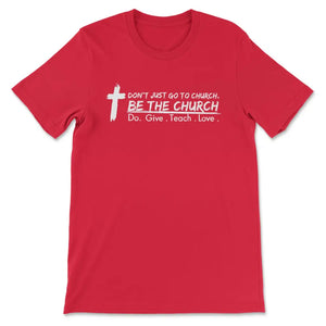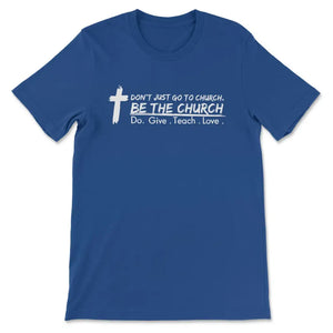 Inspire action with our "Don't Just Go To Church, Be The Church" T-shirt. Featuring a bold cross and the powerful message "Do. Give. Teach. Love.", this shirt reminds us to live our faith actively. Perfect for church gatherings, casual outings, or as a conversation starter, it encourages you and others to embody Christian values every day. Share this meaningful message and gift it to friends and family to uplift and motivate them in their spiritual journey. Ideal for both men and women, this tee is a testament to living out your faith.