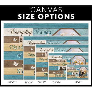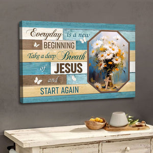 This Christian wall art canvas features the inspiring message, "Every Day is a New Beginning, Take a Deep Breath of Jesus and Start Again". Complemented by a vase of beautiful flowers, it's a constant reminder that each new day brings fresh opportunities to begin anew with Jesus. Ideal for any room in your home or office, this canvas print is also a thoughtful gift for anyone who could use a daily dose of faith and positivity.