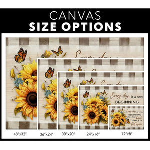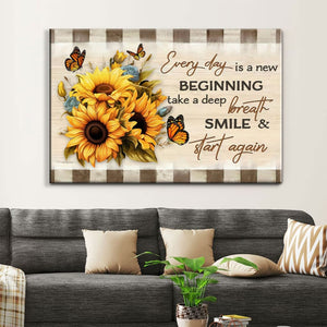 This Christian wall art canvas showcases sunflowers and a butterfly, accompanied by the uplifting message, 'Every day is a new beginning. Take a deep breath, smile, and start again.' It's the perfect gift for moms, grandmas, sisters, daughters, friends, or someone special in your life.