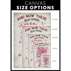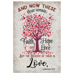This Bible verse wall art canvas is inspired by 1 Corinthians 13:13 'And now these three remain: faith, hope and love. But the greatest of these is love.' This beautiful canvas print is a thoughtful Christian gift for weddings, anniversaries, and other special occasions.