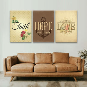 This "Faith, Hope, Love" 3-panel canvas wall art beautifully combines art and faith, serving as a daily reminder to keep faith, hold on to hope, but above all - love. Built to last and ready to hang. it's an ideal Christian gift for friends and family on special occasions, supporting them in their faith journey.