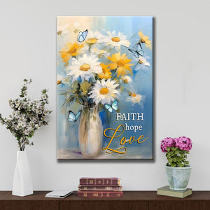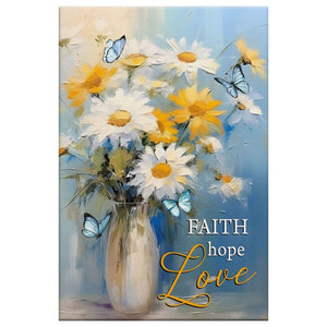 This 'Faith Hope Love' wall art canvas features a painting of butterflies and daisies in a vase. It serves as an encouraging reminder for you and your family to maintain faith, hold on to hope, and above all, to love. This Christian canvas print makes an excellent gift for a loved one on any occasion.