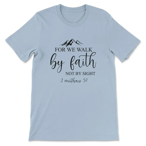 This Christian t-shirt features the powerful verse "For we walk by faith, not by sight" from 2 Corinthians 5:7, beautifully adorned with an elegant script and a serene mountain design. Perfect for daily wear or church gatherings, this shirt serves as a reminder of the strength found in faith. Ideal for both men and women, it makes a thoughtful gift for birthdays, holidays, or just because. Wear it to inspire others and to share your faith effortlessly.