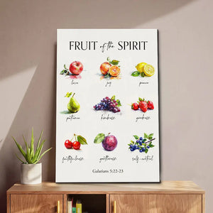 Hang this "Fruit of the Spirit" Christian wall art canvas to bring a daily reminder of God’s virtues into your home. Featuring beautiful watercolor illustrations of nine fruits representing love, joy, peace, patience, kindness, goodness, faithfulness, gentleness, and self-control, this design captures the essence of Galatians 5:22-23. Perfect for kitchens, dining rooms, or living spaces, it’s an inspiring gift for loved ones, ideal for any occasion or just because.