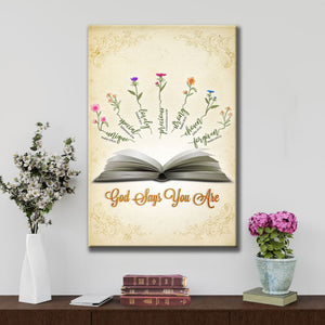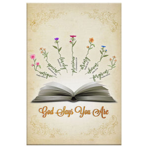 Inspired by multiple scriptures, this "God Says You Are" wall art canvas is a testament to our unique place in God's heart. Each affirmation - Unique (Psalm 139:13), Special (Ephesians 2:10), Lovely (Daniel 12:3), Precious (1 Corinthians 6:20), Strong (Psalm 18:25), Chosen (John 15:16), and Forgiven (Psalm 103:12) - serves as a reminder of God's love and purpose for us. This Christian canvas print makes a comforting and uplifting addition to any room in your house and is a perfect gift for loved ones to remind them of their worth in God’s eyes.