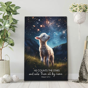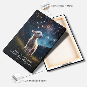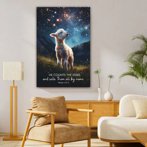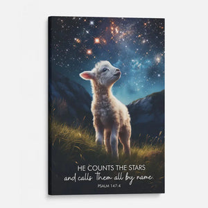 This Christian wall art canvas features a tiny lamb looking up at the night sky filled with millions of stars. The serene scene beautifully illustrates Psalm 147:4, "He counts the stars and calls them all by name," reminding us of God's attention to detail and love for all His creation.