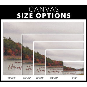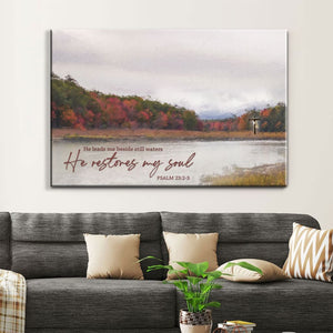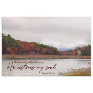 Hang this thoughtful canvas print in your home or office and be inspired by its powerful message from Psalm 23:2-3, 'He leads me beside still waters; he restores my soul.' This Christian wall art serves as a constant reminder of God's guidance and healing power. Built to last and ready to hang, it makes a meaningful gift that encourages loved ones to find comfort and peace in God's love.