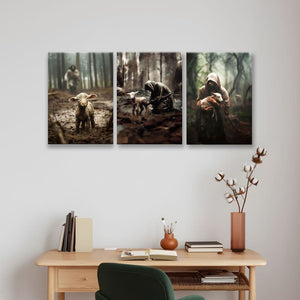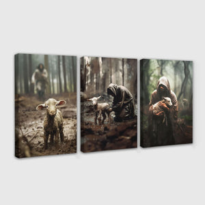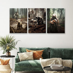 This three-panel Christian wall art canvas beautifully captures the deep love and care of Jesus. Each panel tells a powerful story: Jesus running, rescuing, and carrying a lost sheep, representing His unending love for every individual.