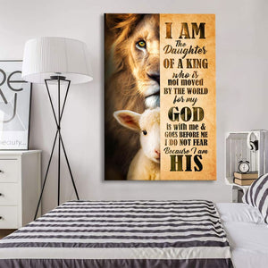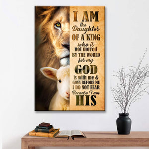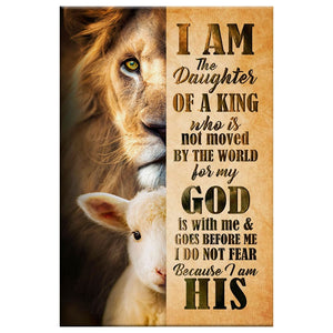 This Christian canvas wall art showcases images of the Lamb of God and Lion of Judah, with an empowering Christian quote: 'I am the daughter of a King who is not moved by the world, for my God is with me and goes before me. I do not fear because I am His.' A perfect gift for any woman in your life who draws strength from her faith - whether it's your mother, sister, friend, or daughter.