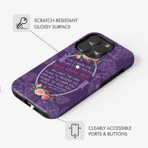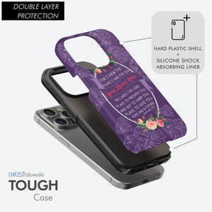 This Christian phone case features a beautifully personalized design with your name alongside the full verse, "For I know the plans I have for you, declares the Lord, plans to prosper you and not to harm you, plans to give you hope and a future." Surrounded by vibrant floral accents, this case is both inspiring and protective. It's a perfect daily reminder of God's promises.