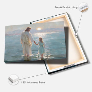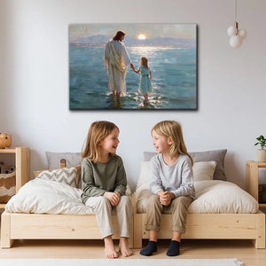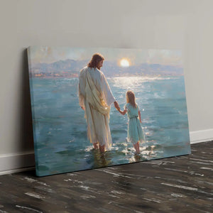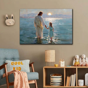 This touching Christian wall art canvas shows Jesus holding the hand of a little girl as they walk together across calm waters into the sunset. It reflects the heart of Isaiah 43:2, “When you pass through the waters, I will be with you.” The scene speaks of gentle guidance, protection, and the steady love of Christ for His children. It brings comfort and peace, reminding us daily that God is always near, leading us step by step.