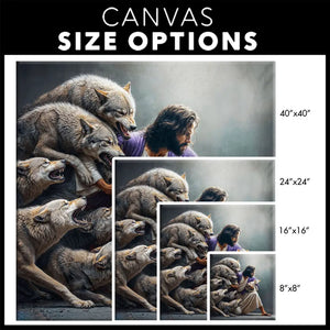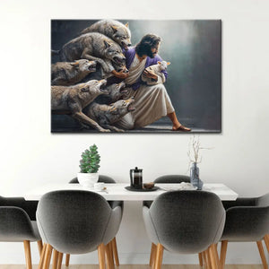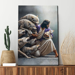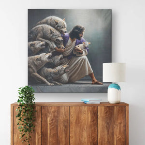 This Christian wall art canvas shows Jesus protecting a lamb from wolves. The imagery powerfully reflects His love and care, reminding us that He shields us from danger and guides us through life’s challenges.