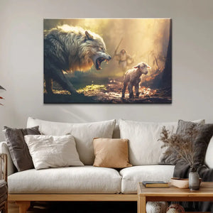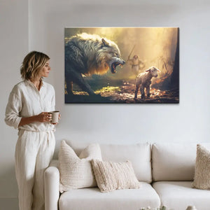 Inspired by John 10:11, where Jesus says, “I am the good shepherd. The good shepherd lays down his life for the sheep,” this image shows Jesus rushing toward danger to save one small, helpless lamb. The fierce wolf shows life’s dangers, but the lamb reminds us that we are never alone. Jesus sees us, cares for us, and will always fight for us. This canvas offers a daily reminder of His love, strength, and promise to protect those who belong to Him.