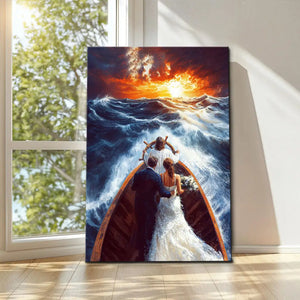 This Christian wall art canvas shows Jesus taking the wheel and steering a ship through rough seas with a married couple behind Him. It serves as a powerful reminder of trusting Christ to lead through the storms, offering peace and strength.