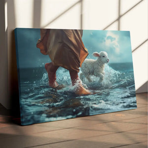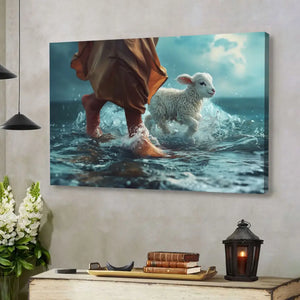 Hang this beautiful "Jesus Walk on Water with a Lamb" Christian wall art canvas in your living room, bedroom, prayer room, hallway, office, or church space. The image of Jesus walking on water with a lamb by His side serves as a powerful symbol of His love, protection, and unwavering guidance.