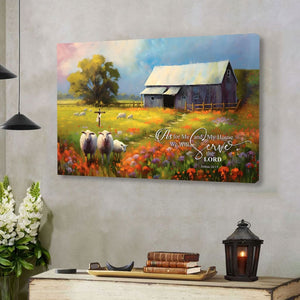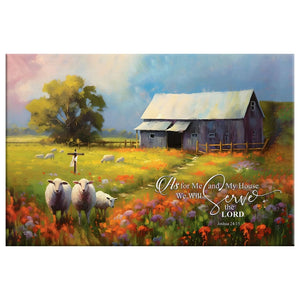 This 'As for me and my house' wall art canvas showcases an old barn adorned with sheep and flowers, making it a bold statement of faith for your home. It is perfect as a new home or housewarming gift, for any special occasion, or even as a declaration and reminder for your own family home to serve the Lord together daily.
