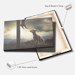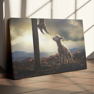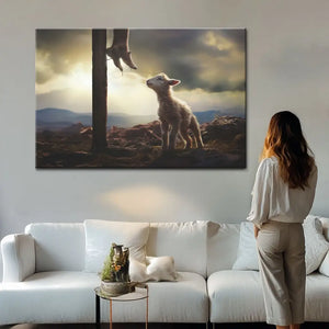 This Christian wall art canvas captures a tender moment where a lost lamb looks up at the feet of Jesus, serving as a profound reminder of Jesus' love and salvation for us. This Christian art is a heartfelt gift for Easter, baptisms, confirmations, or as a comforting presence during tough times. Ideal for a child's room, family spaces, or as reassurance for a close friend, it encourages peace and reflection wherever it is placed.