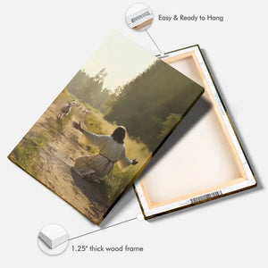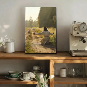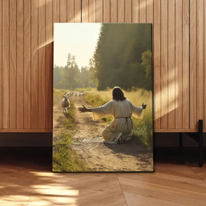 This Christian wall art beautifully captures Jesus with open arms, calling to a small lamb on a peaceful dirt road. It’s a touching reminder of the Parable of the Lost Sheep (Luke 15:3-7), where Jesus, our Good Shepherd, seeks out the one who has wandered away. No matter how far we stray, His love never fails—He calls us by name and welcomes us back with open arms.