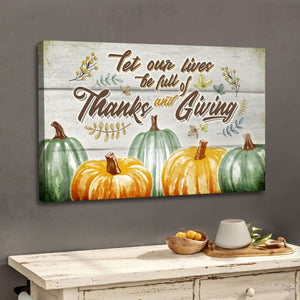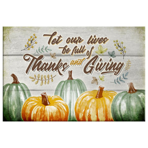 Add warmth and gratitude to your home this fall and Thanksgiving season with this beautifully designed 'Let Our Lives Be Full of Thanks and Giving' wall art canvas. Acting as a daily reminder of gratitude and selflessness, it's perfect for any space, be it your dining area, living room, or hallway. It also makes a thoughtful gift for friends and loved ones.