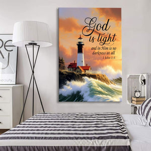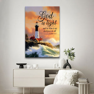 This Christian wall art canvas features a lighthouse with the Bible verse 1 John 1:5, "God is light and in him is no darkness at all." The canvas print is perfect for any room in your home or office, and makes a great gift for anyone who loves the Lord, It serves as a reminder of God's enduring light even in our darkest hours.