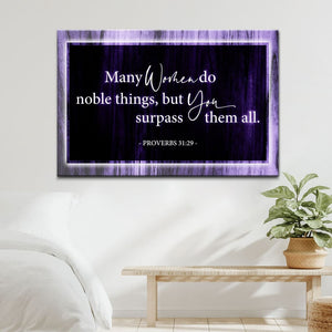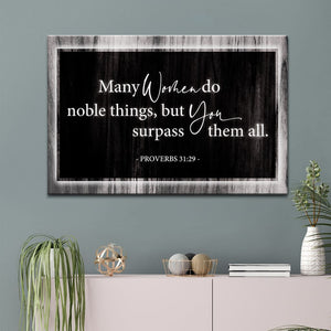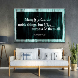 This Christian wall art canvas features the uplifting words from Proverbs 31:29 "Many women do noble things, but you surpass them all." Hang it in your living room, bedroom, or office as a personal reminder of your worth and as an inspiring piece to share with others. A thoughtful and meaningful Christian gift for any occasion, including birthdays, mother's day, holidays, or just because. Give it to the special women in your life to encourage and uplift them in their journey of faith.
