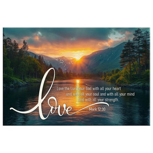 Adorn your space with this Christian wall art canvas featuring Mark 12:30: "Love the Lord your God with all your heart and with all your soul and with all your mind and with all your strength." The serene lake, majestic mountains, and radiant sunset remind you of God's love and creation. Perfect for living rooms, bedrooms, or offices. Great for birthdays, anniversaries, housewarming or Christmas gifts. Bring peace and inspiration to any room with this beautiful canvas.