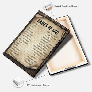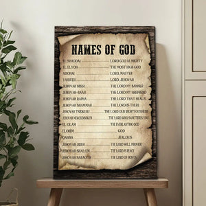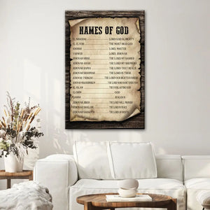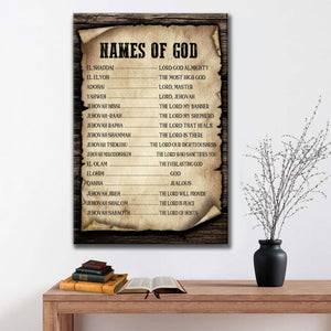 Hang this Names of God wall art canvas to celebrate the profound beauty of His names. Featuring a rustic parchment design, it lists the many names of God, from El Shaddai to Jehovah Sabaoth, each with its English meaning. This Christian wall art reminds us to call on Him anytime and reflects His multifaceted nature.