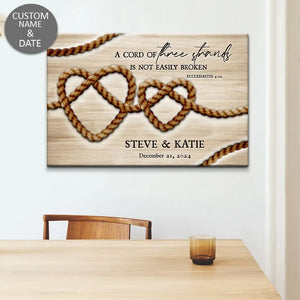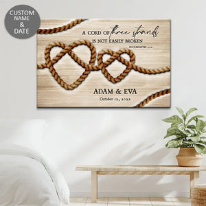 This personalized Christian wall art canvas features Ecclesiastes 4:12: "A cord of three strands is not easily broken." The design shows three intertwined cords forming hearts, symbolizing love and togetherness. Perfect for a living room, bedroom, or entryway, it serves as a daily reminder of God's presence and the strength of unity.