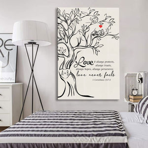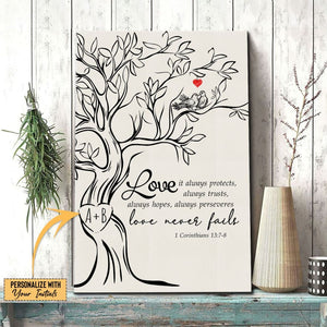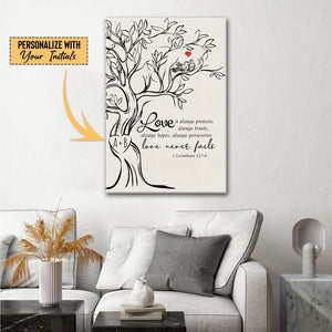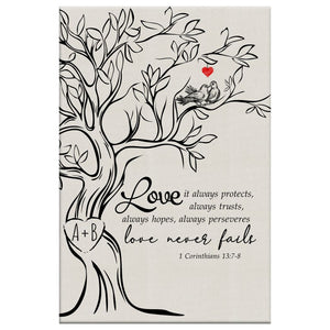 This Christian wall art canvas shows a strong tree with the words from the Bible, "Love, it always protects always trusts always hopes always perseveres. love never fails" from 1 Corinthians 13:7-8. You can add your own initials to the tree, making it a special piece for you and someone you love. It's perfect for a wedding gift, an anniversary, or just to say "I love you." Hang this in your home to always remind you of the power of love.