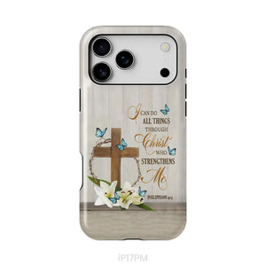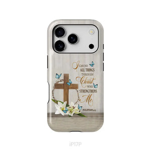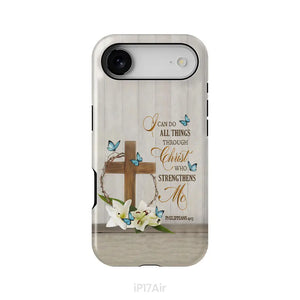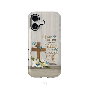 Carry your faith wherever you go with this beautifully designed Christian phone case. It's adorned with a wooden cross with a Crown of Thorns, a lily, butterflies, and features the inspiring Bible verse from Philippians 4:13, 'I can do all things through Christ who strengthens me.' This phone case not only ensures your phone's protection, but it also serves as a constant reminder of the strength you draw from Christ. It's the perfect Christian gift for friends and loved ones on any occasion, including Mother's Day, Father's Day, Baptism, Christmas, or simply 'just because'