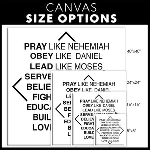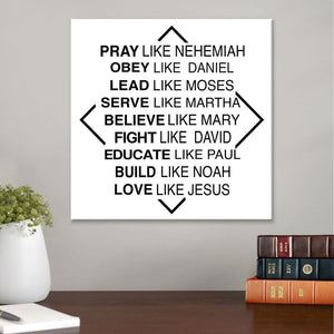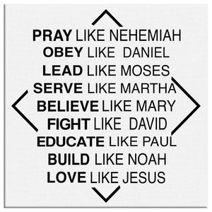 This Christian wall art canvas reads 'Pray like Nehemiah, obey like Daniel, lead like Moses, serve like Martha, love like Mary, fight like David, educate like Noah, build like Paul, love like Jesus' A perfect Christian gift for your friends and loved ones.
