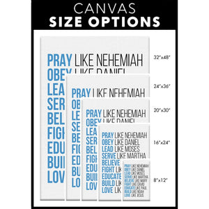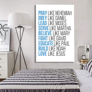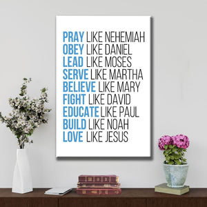 This Christian wall art canvas reads 'Pray like Nehemiah, obey like Daniel, lead like Moses, serve like Martha, Believe like Mary, fight like David, educate like Paul, build like Noah, love like Jesus'. A perfect Christian gift for your friends and loved ones.