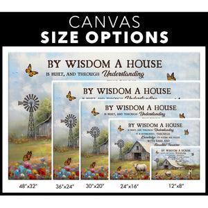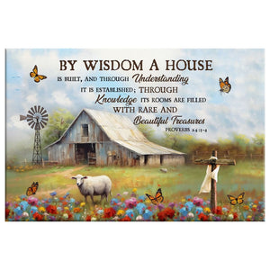 This 'By Wisdom a House Is Built' wall art canvas print showcases the Proverbs 24:3-4 NIV verse: 'By wisdom a house is built, and through understanding it is established; through knowledge its rooms are filled with rare and beautiful treasures.' It serves as a constant reminder of the importance of wisdom, understanding, and knowledge in creating a harmonious home. It is the perfect Christian gift for house-warming or a new home, and would make a stunning addition to any room.