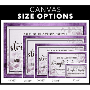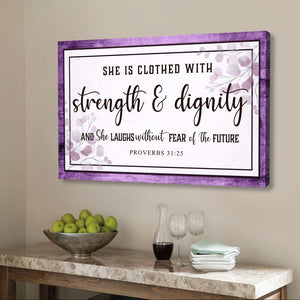 Display this 'she is clothed with strength and dignity' Proverbs 31:25 wall art canvas where its message reminds you daily that God clothes you with strength and dignity, and, that with Him by your side, you have no reason to fear the future. Makes an encouraging Christian gift for any occaion or simply just because.